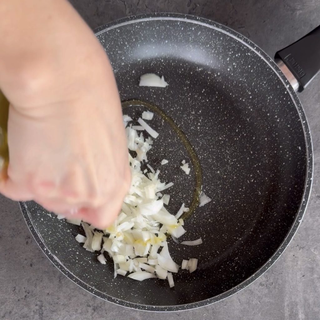 Comece a preparar as Tirinhas de frango com ervilhas, pique finamente a cebola e coloque-a em uma panela,