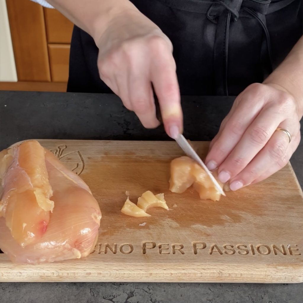 Remova qualquer osso e gordura do peito de frango, corte-o em tiras e