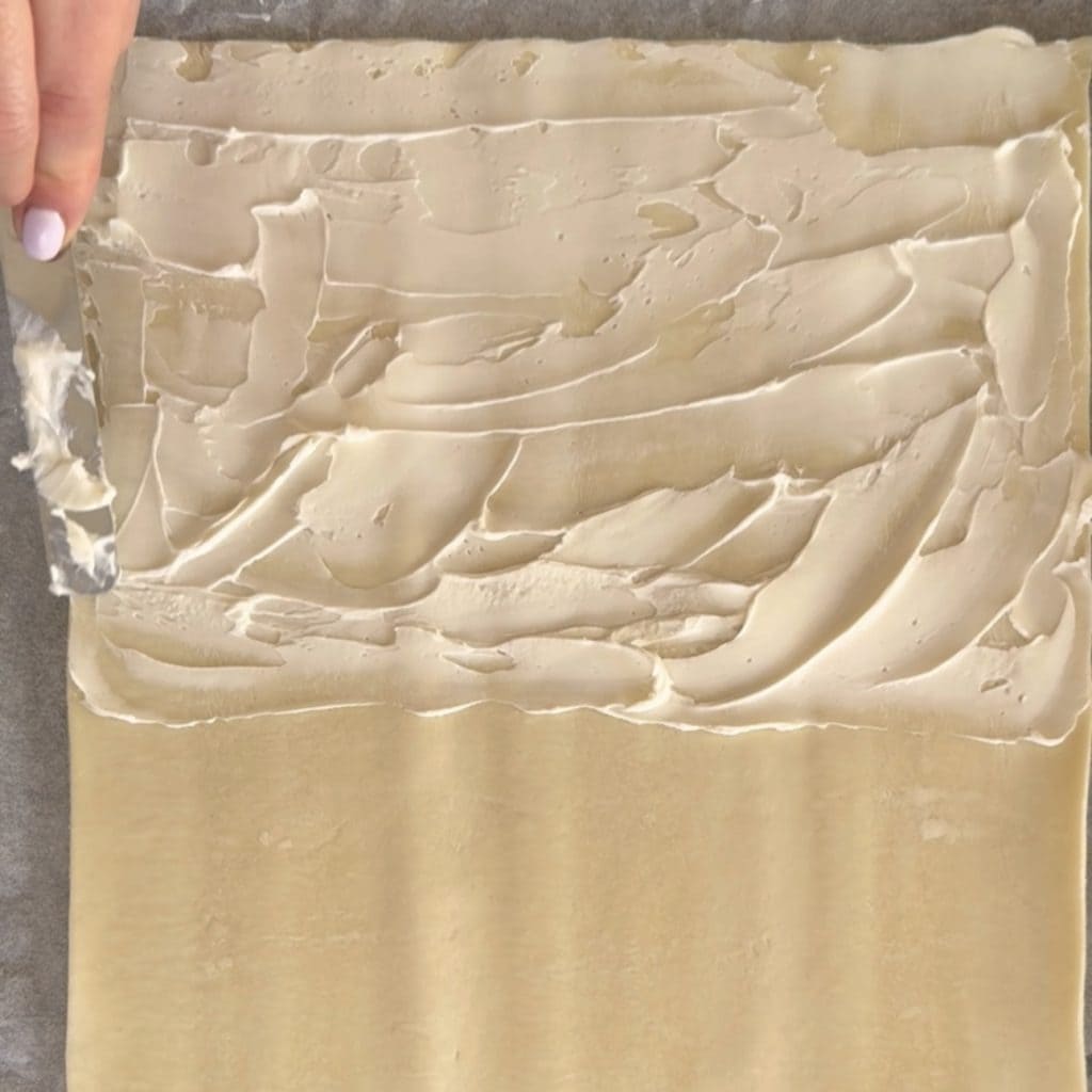 Desenrole a massa folhada e mantenha o lado mais curto à sua frente, em metade da massa folhada espalhe o queijo cremoso, eu usei philadelphia,