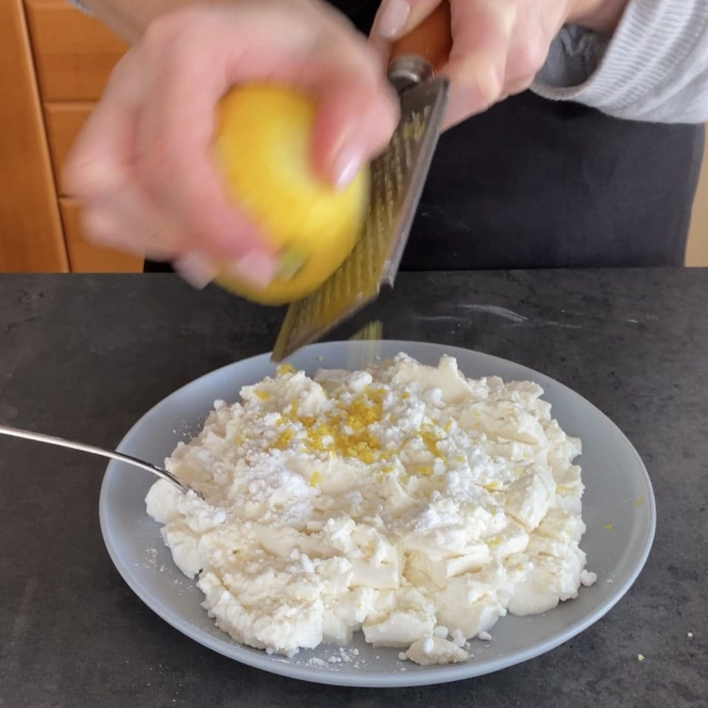• Enquanto isso, coloque a ricota em um prato e trabalhe com um garfo para torná-la cremosa, adicione o açúcar de confeiteiro,