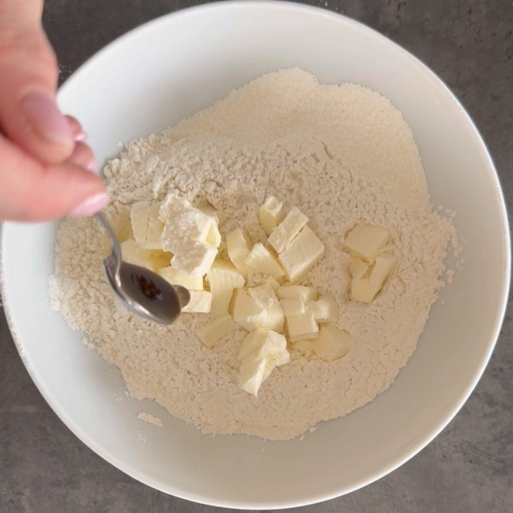 • uma colher de chá de essência de baunilha. Misture tudo até obter uma mistura arenosa,