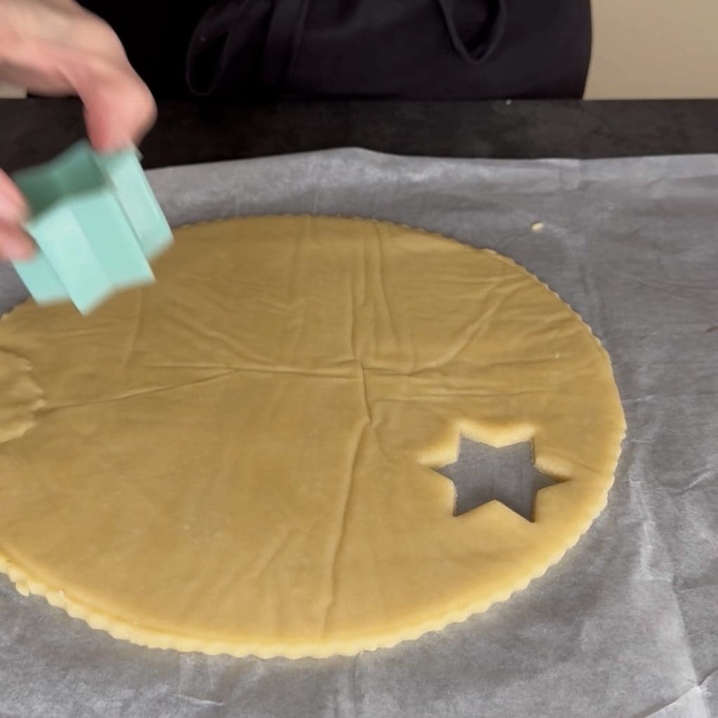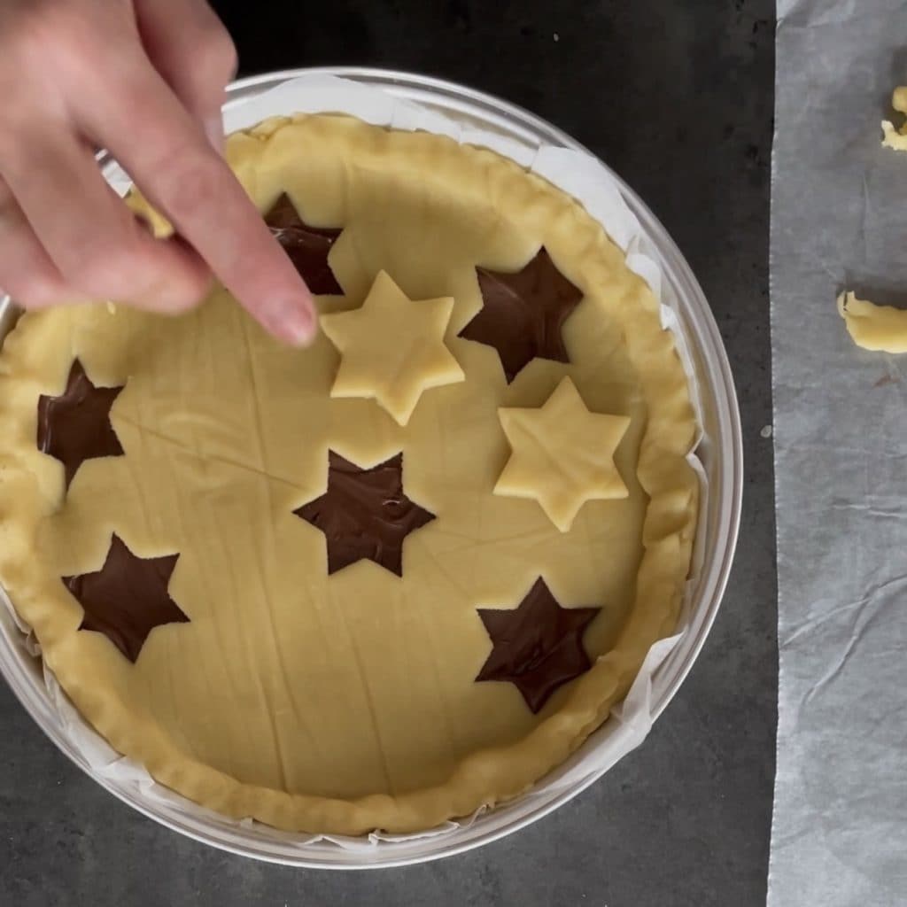 • Coloque o disco de massa com os furos de estrela em cima da nutella e feche bem, dobrando a borda.