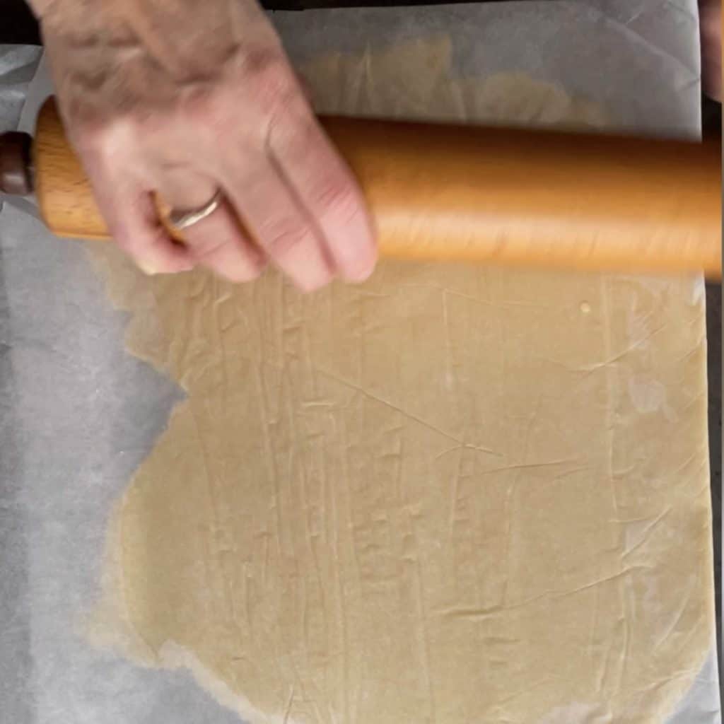 • Abra as duas partes da massa entre duas folhas de papel manteiga com um rolo, e depois deixe descansar na geladeira por 30 minutos.