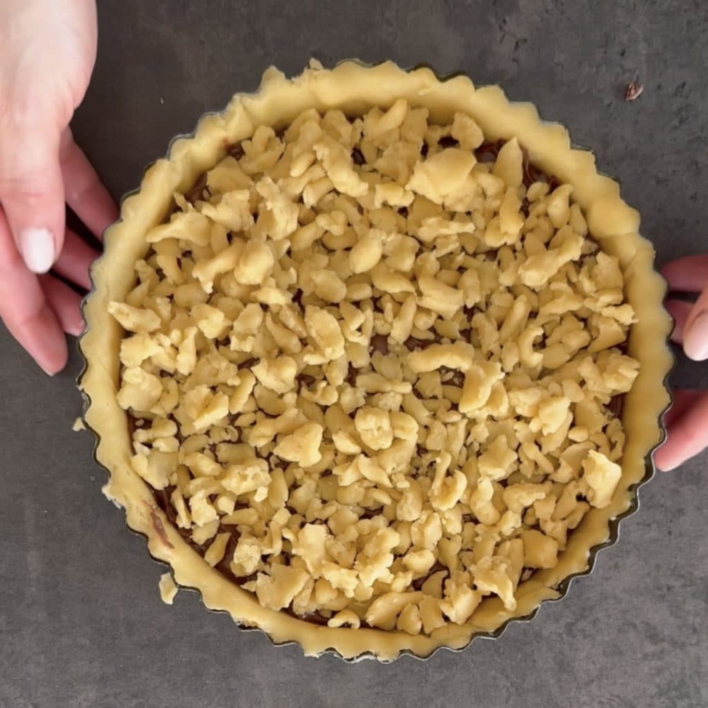 Torta Esmigalhada de Chocolate deliciosa sobremesa de massa de biscoito e Nutella, muito fácil e deliciosa. Como você pode ver, com a massa de biscoito se fazem não apenas biscoitos e tortas, mas também maravilhosos bolos. Um deles é, sem dúvida, a esmigalhada de Nutella, uma sobremesa muito fácil de fazer e muito deliciosa. Você pode prepará-la com qualquer creme de avelã ou preparar o seu próprio creme de avelã e cacau caseiro, sem óleo de palma, sem glúten, portanto adequado para celíacos, livre de corantes e aditivos adicionais. A esmigalhada também pode ser preparada com outros recheios, como maçãs ou pistache. A quantidade é para uma forma de 20 cm. Se usar uma forma maior, faça uma dose dupla e, se sobrar massa, você pode preparar biscoitos. Vamos ver agora como fazer a esmigalhada de Nutella e, se você experimentar, me avise. Barbara