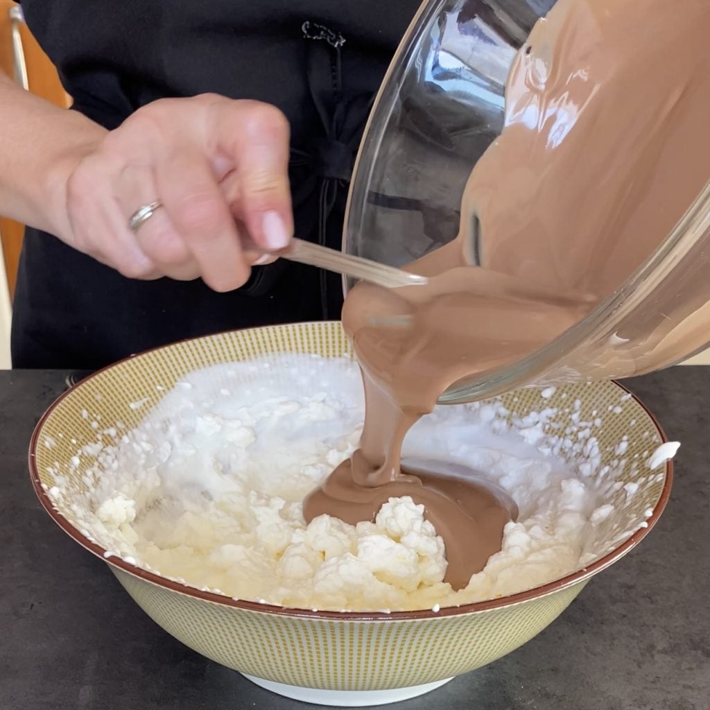 • Quando o creme Kinder estiver frio, despeje-o na tigela com o creme de leite batido