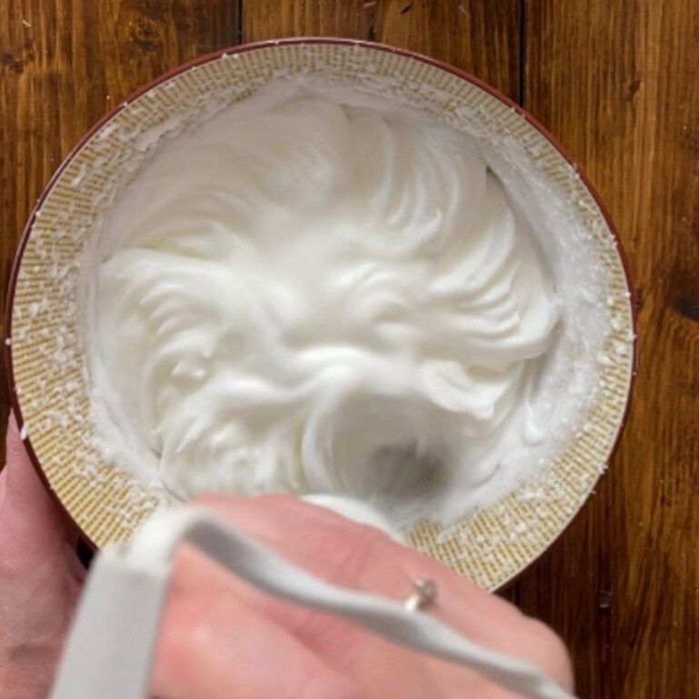 Separe os ovos, coloque as claras em uma tigela e bata com batedeiras elétricas até ficarem em ponto de neve.