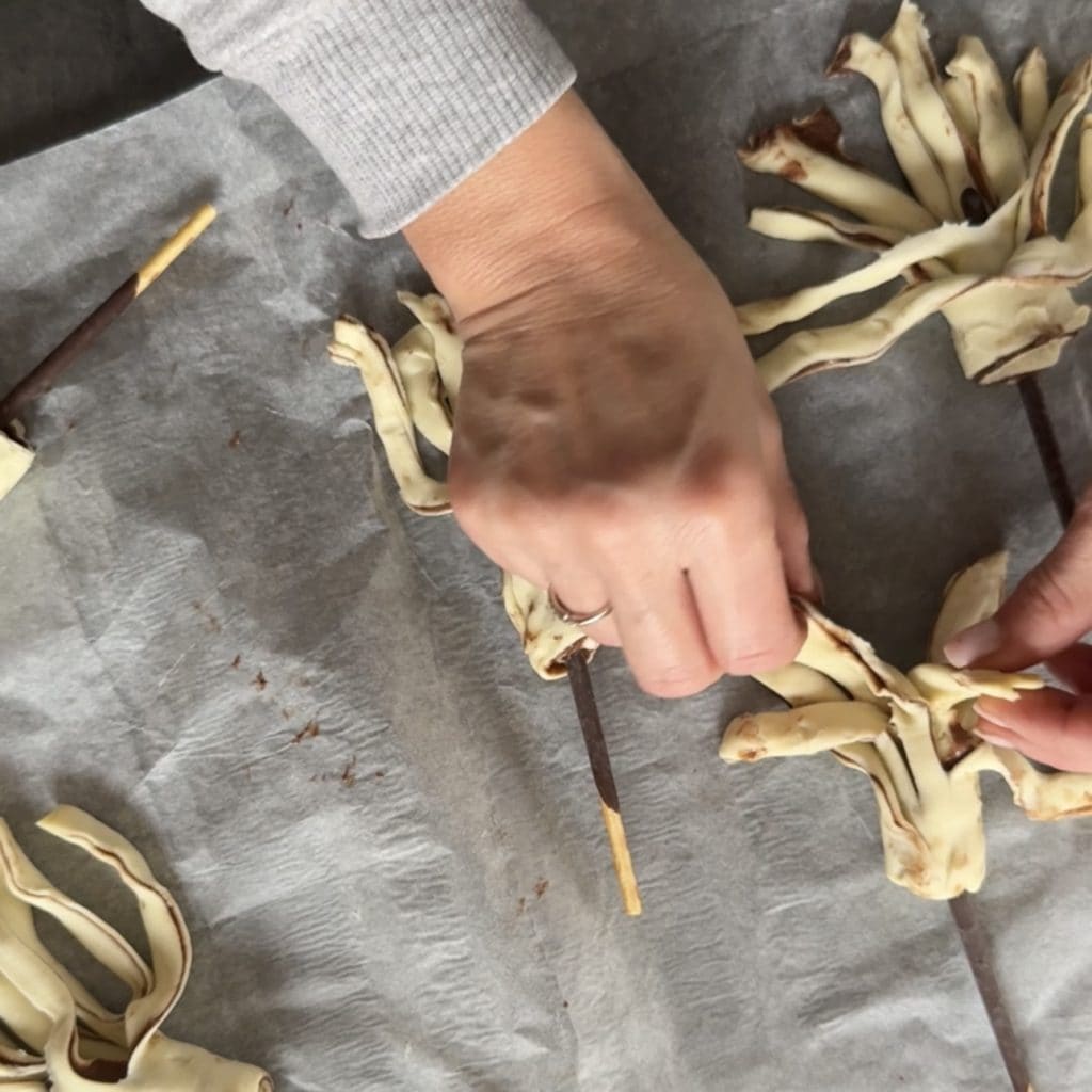 Quando terminar todas as vassourinhas, coloque-as na assadeira com o papel manteiga e alargue as tiras, de forma aleatória, para dar naturalidade às vassourinhas.