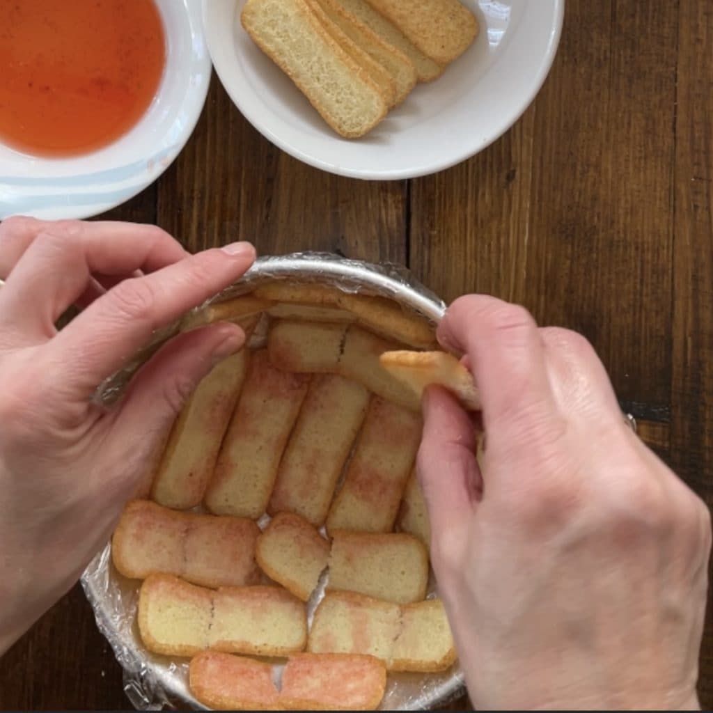 Retire os morangos da geladeira, coloque o suco de marinada que se formou em uma tigela, reserve os morangos e forre a forma com filme plástico. Passe os pavesini no suco de marinada dos morangos e disponha-os no fundo da forma.