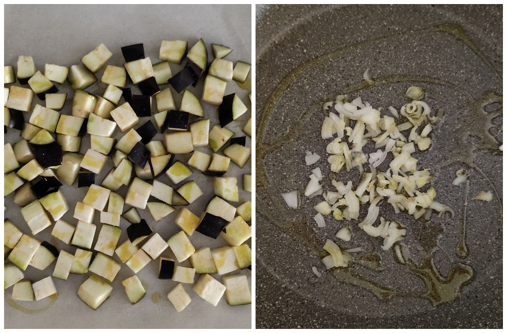 • Lave e limpe a berinjela. Em seguida, corte em fatias de 1 cm de espessura e, a partir delas, corte em cubinhos. Disponha-os numa assadeira forrada com papel manteiga, salgue e regue com um fio de azeite.
