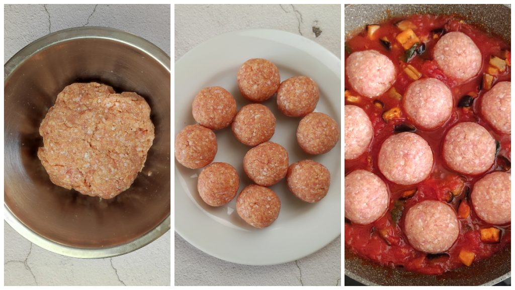 • Misture tudo até obter uma massa homogênea e não muito dura. Modele as almôndegas e mergulhe-as no molho de berinjela.
