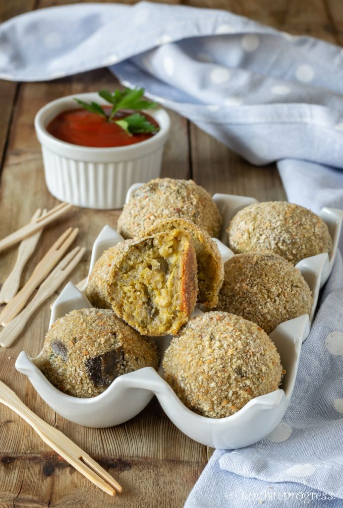As ALMÔNDEGAS DE BERINJELA ASSADAS NO FORNO são uma receita fácil, rápida, de aroma exótico e também leve, já que levam cozimento no forno e pouquíssimos gorduras. Essas bolinhas são ótimas como finger food de verão na hora do aperitivo, ou como entrada, inclusive vegetariana; ficam boas quentes ou mornas, especialmente acompanhadas por um molho de tomate fresco ou por um de iogurte com salsinha.