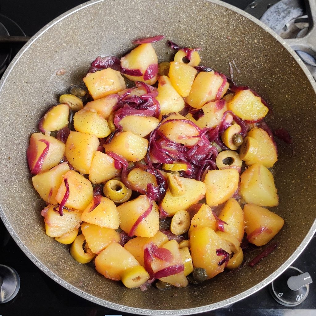 As batatas, cortadas em cubinhos, escaldadas e douradas na frigideira com cebolas roxas docinhas, são realçadas por um molho irresistível à base de vinagre e açúcar, típico da tradição insular, alcaparras e azeitonas.