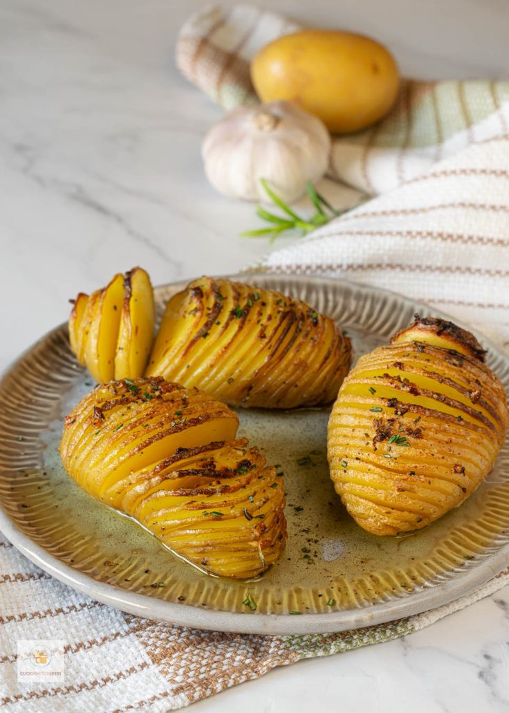 As BATATAS HASSELBACK são um acompanhamento cenográfico e irresistível, perfeito para enriquecer qualquer mesa com simplicidade e elegância. Originárias da Suécia, essas batatas se destacam pelo característico corte em sanfona: finas incisões que não chegam até o final, permitindo que a batata se abra levemente durante o cozimento e fique crocante por fora e macia por dentro.