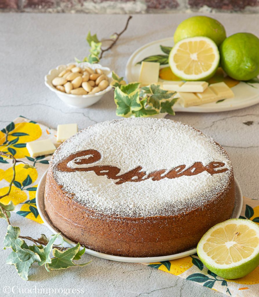 A base é preparada com amêndoas finamente trituradas, chocolate branco e raspas de limões não tratados, que dão ao pedaço um perfume intenso e uma doçura delicada. Cada fatia é um pequeno pedaço de verão, ideal para saborear sozinha, polvilhada com açúcar de confeiteiro, ou acompanhada de um chantilly ou uma bola de sorvete para um toque ainda mais gostoso.