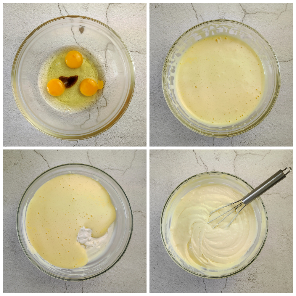 • Numa tigela coloque os ovos e o extrato de baunilha. Bata com as batedeiras elétricas até ficarem claros e espumosos.