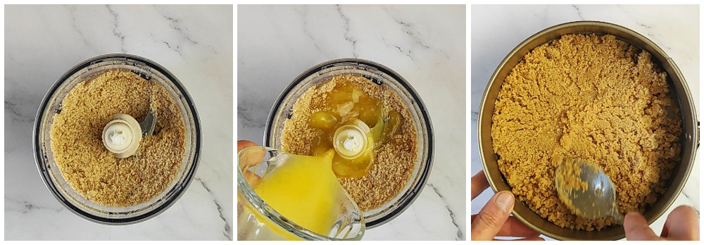 Coloque os biscoitos no processador e triture bem. Junte a manteiga derretida e misture. Forre com papel manteiga uma forma de aro removível de 18-20 cm e cubra as laterais com acetato (se não tiver, não tem problema).