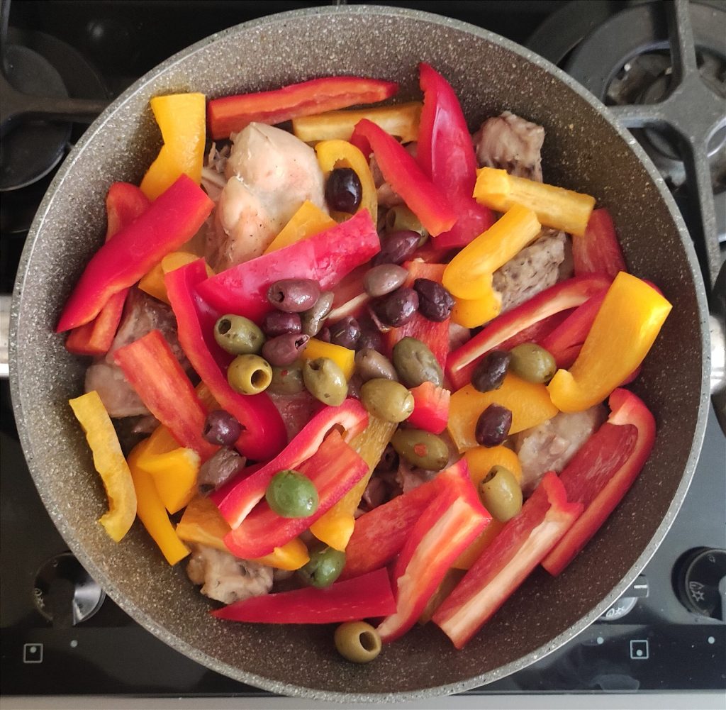 Adicione os pimentões ao coelho, junte então as azeitonas pretas sem caroço, salgue, tampe e deixe cozinhar até que fiquem macios.