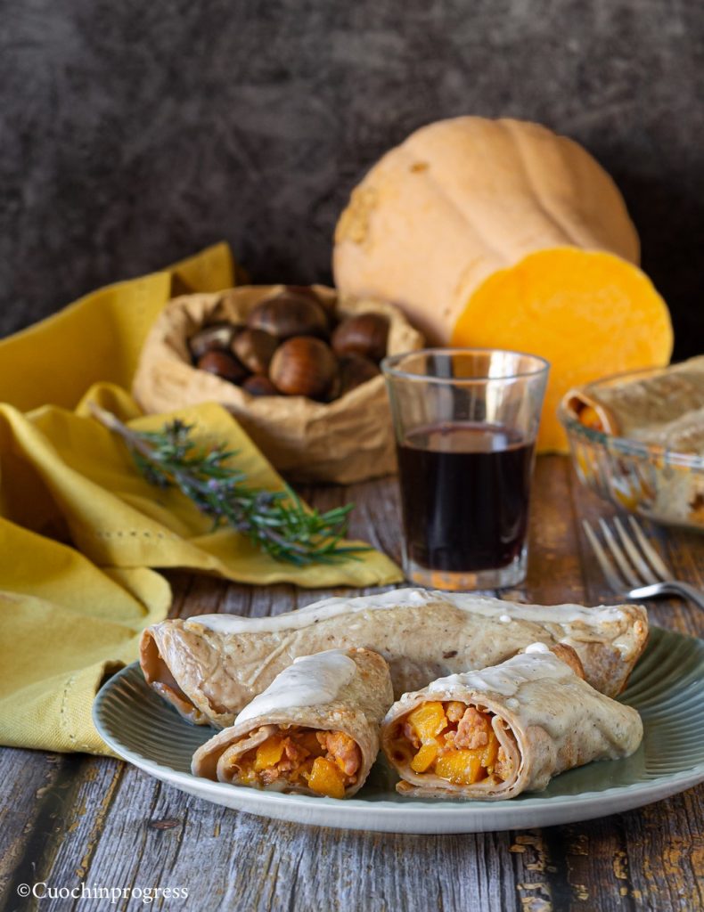 Crepes de castanha com abóbora, linguiça e molho bechamel de porcini