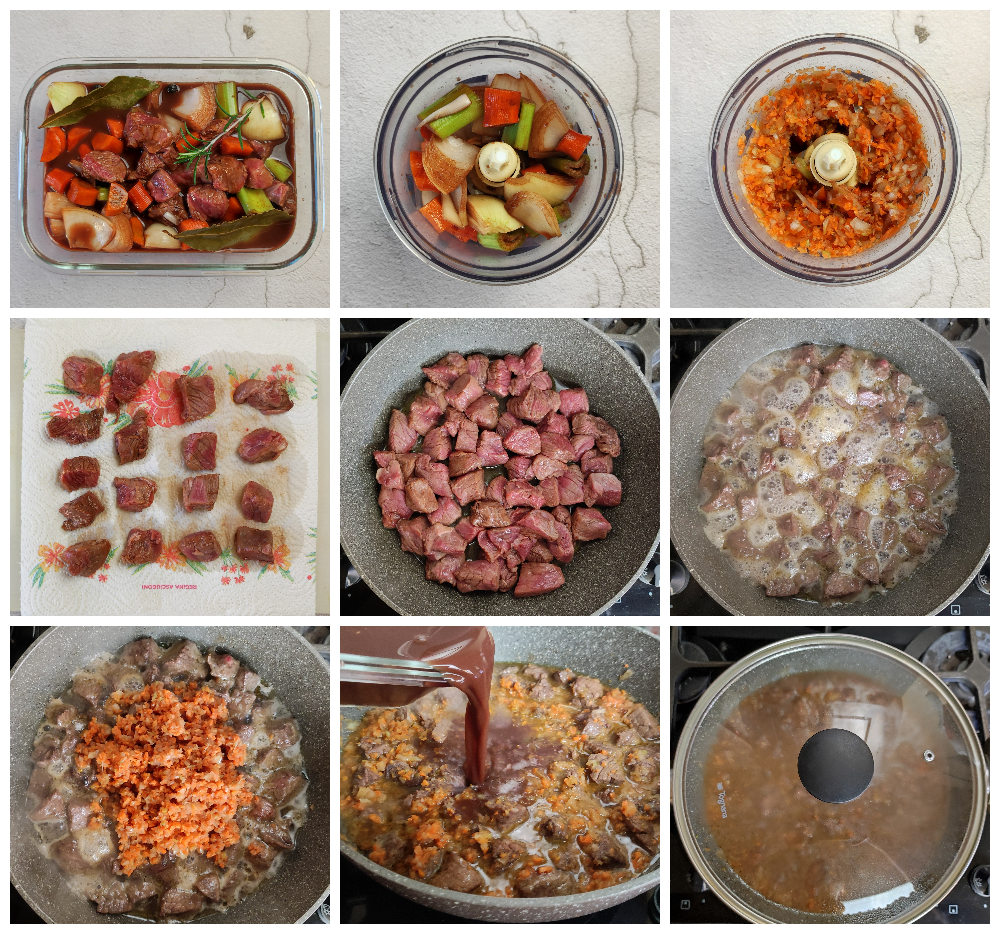 • Corte a carne em pedaços (em tamanho de bocadinhos), lave e corte grosseiramente os legumes e coloque tudo em um recipiente de cerâmica ou vidro.