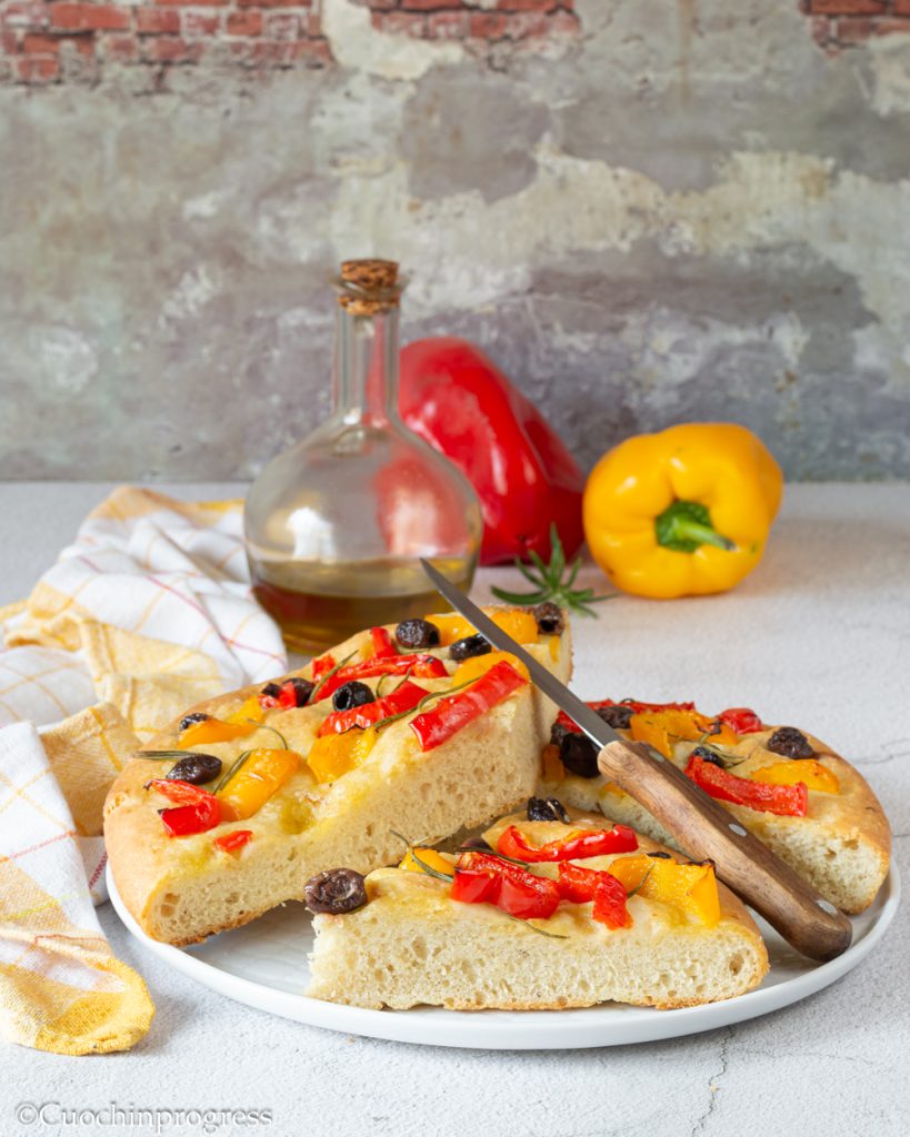 É uma focaccia alegre e colorida, ligeiramente crocante por fora e super macia por dentro, à qual os pimentões e as azeitonas, juntamente com o indispensável e fantástico alecrim, dão sabor e perfume. Semelhante à focaccia barese, deve sua maciez à presença das batatas na massa que, devidamente fermentada, fica saborosa mas permanece leve.