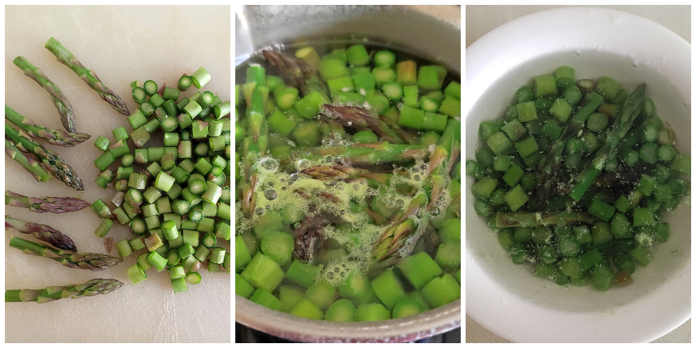 Leve a água ligeiramente salgada para ferver e cozinhe as rodelas de aspargos por 3 minutos. Adicione as pontas, cortadas ao meio, e deixe cozinhar por mais 1 minuto. Escorra-os, coloque-os em água fria e reserve a água do cozimento.
