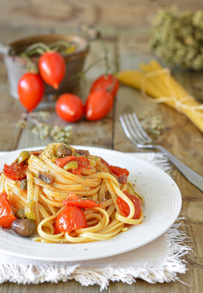 Linguine à marinara com tomatinhos, alcaparras e azeitonas