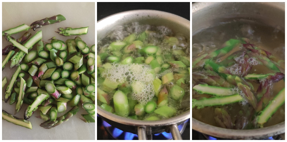 Leve à fervura água salgada e cozinhe as rodelas de aspargo por 5 minutos. Junte as pontas e cozinhe mais 2 minutos.