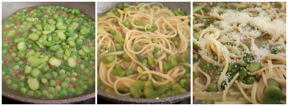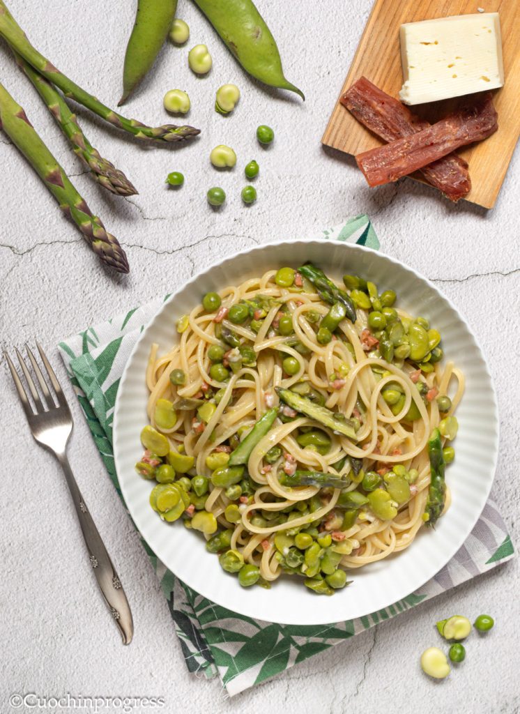 A boa qualidade do prato vem da sua extrema frescura e da combinação de aspargos, ervilhas e favas com as coppiette de porco (que podem ser substituídas, a gosto, por guanciale, pancetta ou speck) e com o pecorino ralado, que combina maravilhosamente com os legumes.