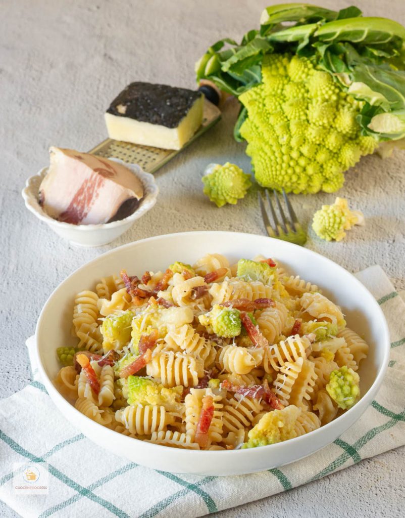 A receita prevê o cozimento do brócolis romanesco, que é branqueado para ficar macio mas ainda consistente, e depois salteado na frigideira com a gordura do guanciale, que dá ao prato um sabor rico e envolvente. O brócolis e o guanciale crocante são então misturados com a massa, preferencialmente curta (como radiatori, rigatoni, mezze maniche ou fusilli), para permitir que os sabores se integrem perfeitamente.
