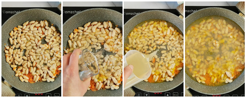 Em uma panela, coloque um fio de azeite e refogue em fogo baixo o alho e um picado de aipo, cenoura e cebola. Salgue levemente, junte os feijões escorridos, acrescente dois ou três copos de água, a água dos mexilhões, uma pitada de sal grosso e leve à fervura.