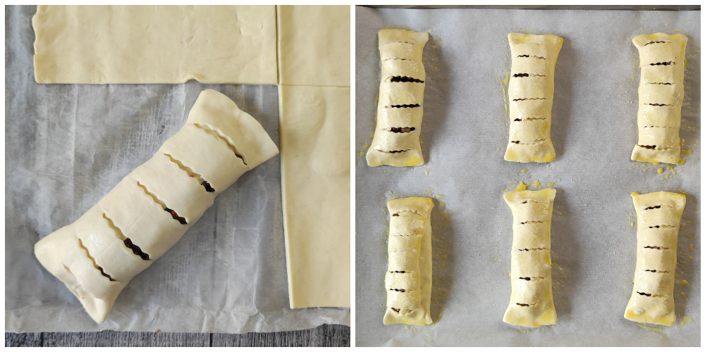 Desenrole a massa folhada e corte 6 retângulos. Coloque o recheio em cada retângulo e faça cortes com uma faca ou roda na parte da massa que ficar vazia. Pincele a massa com a clara e feche, selando bem as extremidades.