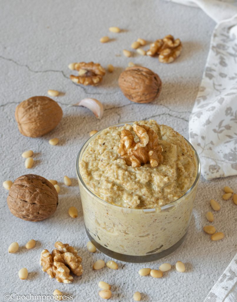 O MOLHO DE NOZES GENOVÊS é um tempero tradicional da cozinha liguriana, especialmente de Gênova, geralmente usado para acompanhar os “pansoti”, mas também perfeito para muitas outras aplicações: pode deixar um prato de massa irresistível ou trazer uma harmoniosa combinação a crostinis servidos como entrada ou aperitivo. É um molho muito antigo e simples, como se percebe pelos ingredientes, mas de um sabor delicado e particular e, por isso, vale a pena experimentar.