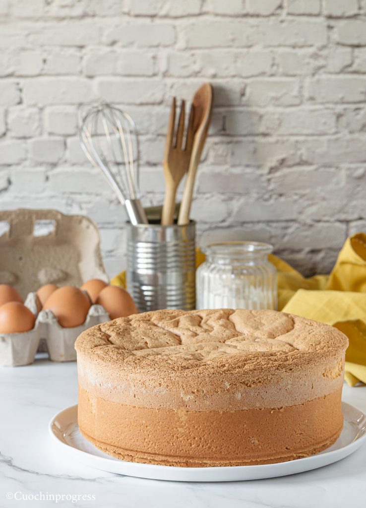 • Uma vez assado, deixe o pão de ló descansar no forno com a portinha entreaberta por 5 minutos, depois retire do forno e deixe esfriar um pouco, então desenforme e deixe esfriar completamente — ainda melhor se fizer isso sobre uma grade, para que a base esfrie bem.