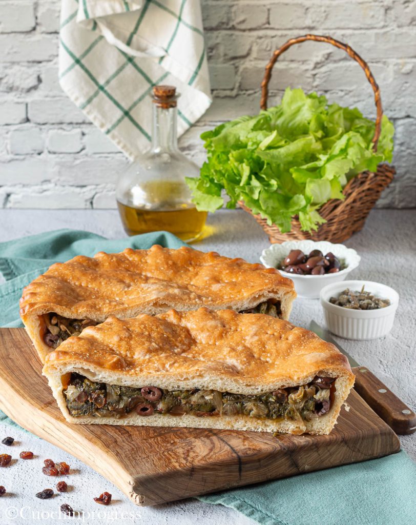 A pizza de escarola é composta por duas camadas de massa fermentada (semelhante à da pizza ou da focaccia) que envolvem um recheio saboroso à base de escarola refogada, azeitonas pretas, alcaparras, anchovas em óleo, uva passa e às vezes pinhões. O resultado é um equilíbrio perfeito entre a doçura da uva passa, a salinidade das anchovas e a delicadeza da escarola.