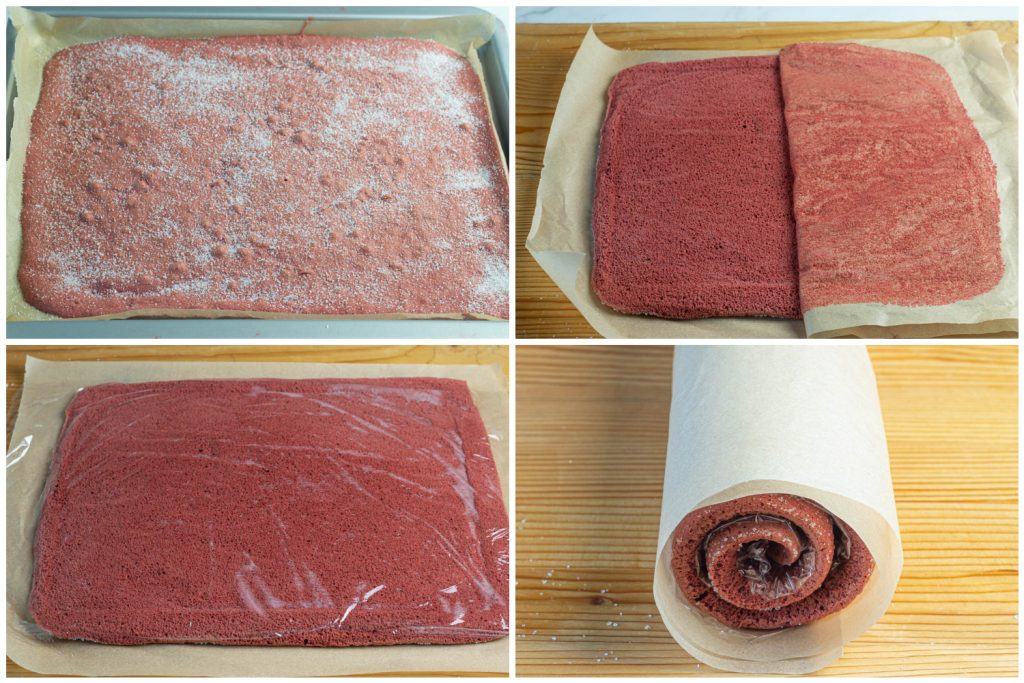 Enrole delicadamente começando pelo lado curto, embrulhe o rocambole no filme plástico e deixe descansar na geladeira por pelo menos 2 horas.