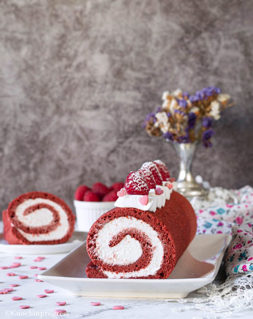 O ROCAMBOLE RED VELVET é uma sobremesa deliciosa, simples, elegante e saborosa, que pode ser servida como sobremesa no fim da refeição ou como um lanche colorido e gostoso para adultos e crianças. Assim como o famoso bolo, este rocambole se destaca pela cor intensa da massa biscuit, macia e esponjosa, e pelo creme branco que o recheia, neste caso uma mistura realmente perfeita de chantili e leite condensado.
