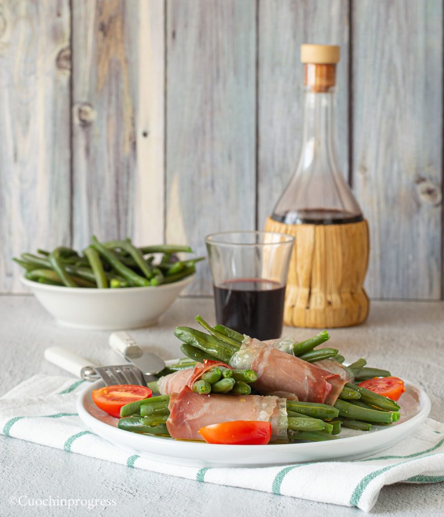 Os ROLINHOS DE VAGEM E PRESUNTO CRU são um prato gostoso, ideal para servir no verão como entrada ou acompanhamento. Prepará‑los é realmente muito fácil e rápido. Na prática, basta escaldar as vagens em água fervente por poucos minutos, resfriá‑las, montar os rolinhos e levá‑los ao forno por alguns minutos. A doçura das vagens combina muito bem com o sabor salgado do parmesão no recheio e, ainda mais, com o do presunto cru, fazendo deste prato uma verdadeira tentação.