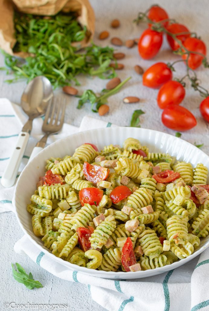 O segredo do prato está no pesto original que envolve a massa e lhe dá, ao mesmo tempo, sabor e cremosidade. Ele é feito com rúcula fresca, amêndoas e queijos (parmigiano e pecorino), que combinam maravilhosamente, trazendo frescor e salinidade, mantendo uma suavidade de sabor que permite harmonizar facilmente com presunto cozido e queijo cortados em cubinhos. Para completar a salada, coloquei tomatinhos docinhos em cachinho, que dão uma nota extra de frescor e leve acidez. Enfim, todos ingredientes fáceis de encontrar, mas que combinados nos oferecem um pequeno primor de sabor.
