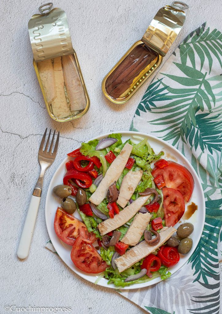A SALADA DE VENTRESCA DE ATUM é uma explosão de sabores e cores. A ventresca de atum, macia e nobre, se une à salinidade das anchovas do Cantábrico e à doçura dos pimentões assados, criando um equilíbrio perfeito.