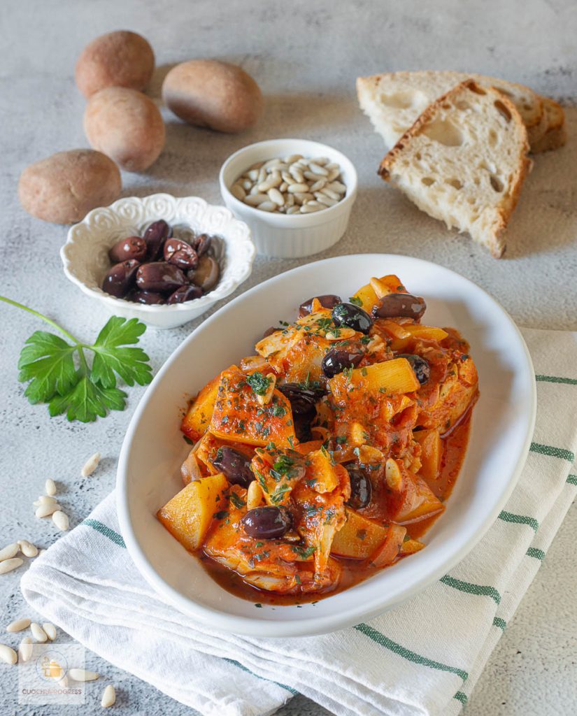 Quando terminar o cozimento, desligue o fogo, tampe e deixe o stoccafisso à genovesa descansar por 10 minutos antes de servir.