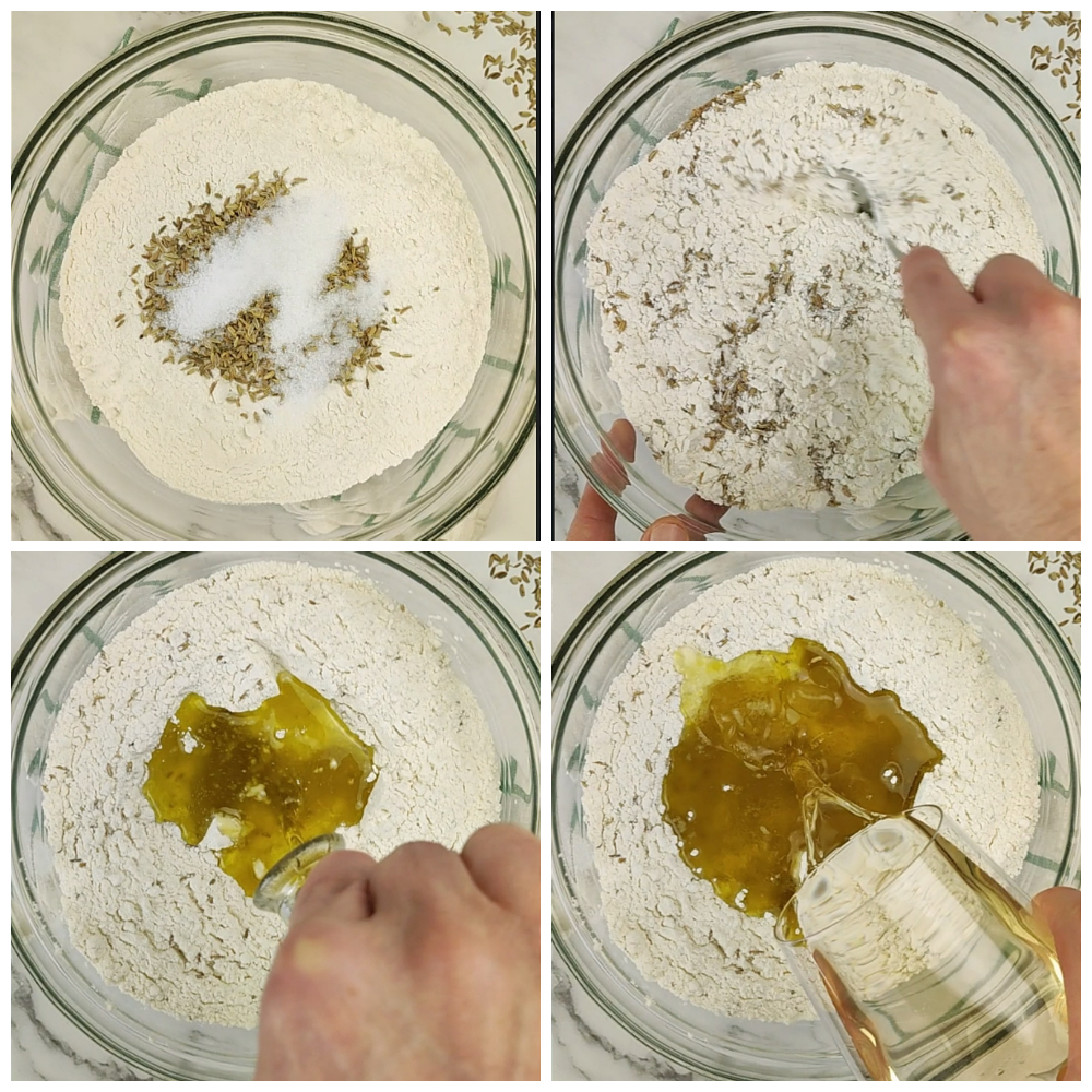 Faça uma cova com a farinha sobre uma superfície de trabalho ou em uma tigela grande. Junte as sementes de funcho, o sal e misture.