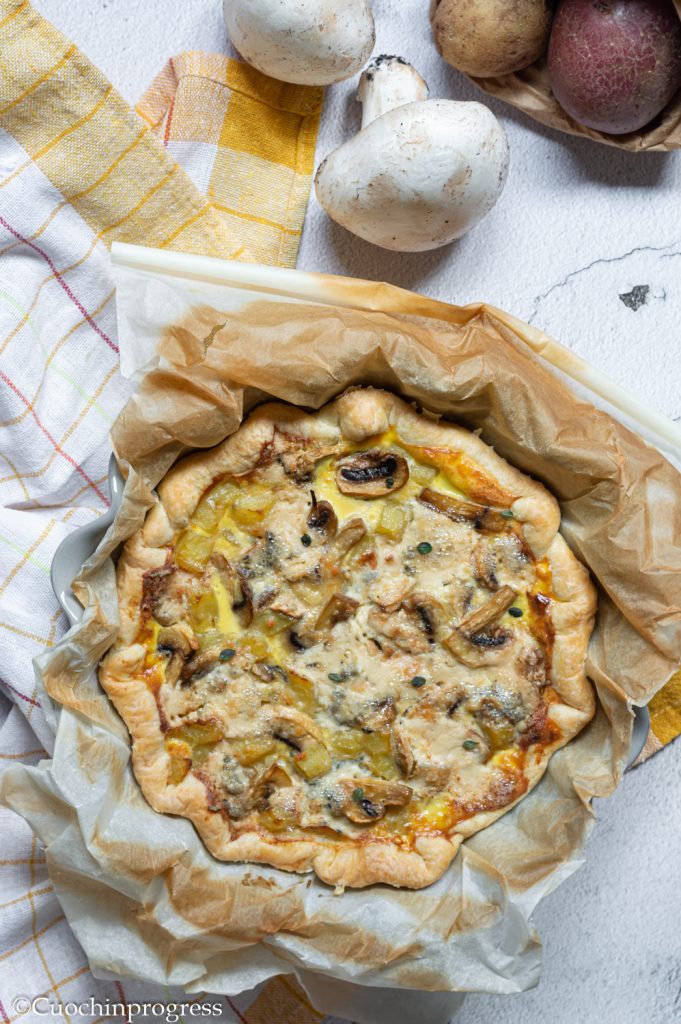 Preparar esta torta salgada requer pouco tempo, que na maior parte será usado para preparar os vegetais, que devem estar já cozidos antes de serem colocados no recheio, que é complementado com ovos e, naturalmente, com queijo bleu. Eu usei um queijo francês, comprado em uma viagem recente, mas é fácil encontrar ótimos queijos azuis também italianos. O aspecto mais divertido do prato está na variedade de sabores e texturas: cogumelos e batatas suaves, queijo levemente picante, massa folhada crocante, creme macio e vegetais suculentos; enfim, uma verdadeira delícia para o paladar.