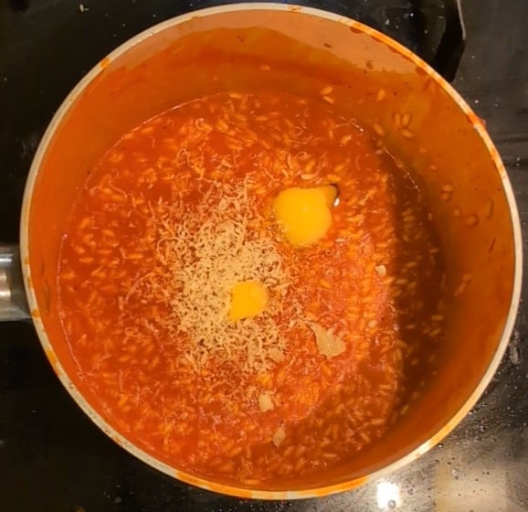 No próximo passo, adicionamos o molho de tomate e mexemos rapidamente por alguns minutos, tomando cuidado para não espirrar em todo lugar e não deixar o arroz grudar na panela. Continuamos a mexer até que o molho e o arroz estejam bem incorporados.
