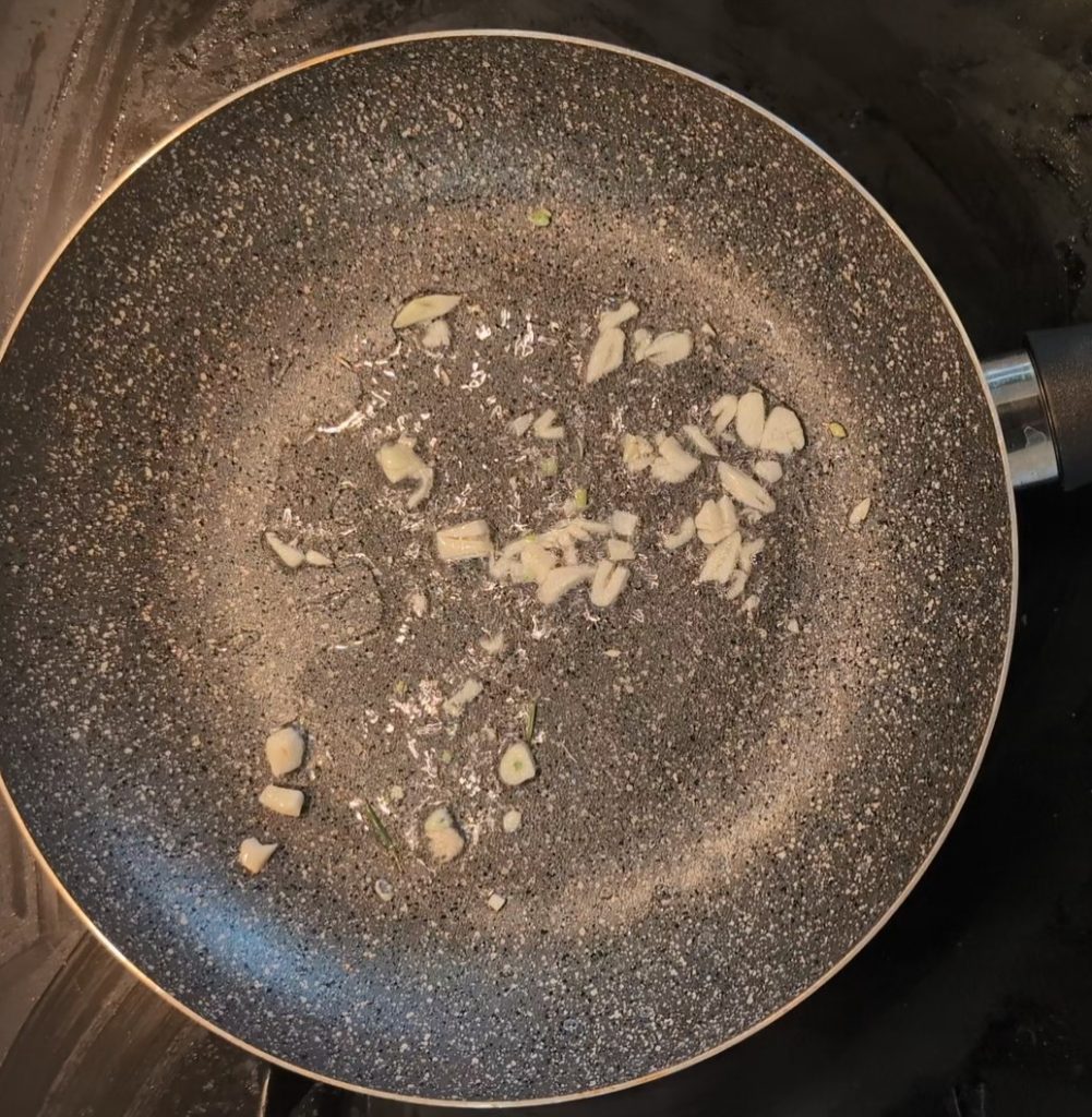 Aqueça o óleo em uma frigideira antiaderente em fogo médio. Adicione o alho picado e refogue até dourar levemente.
