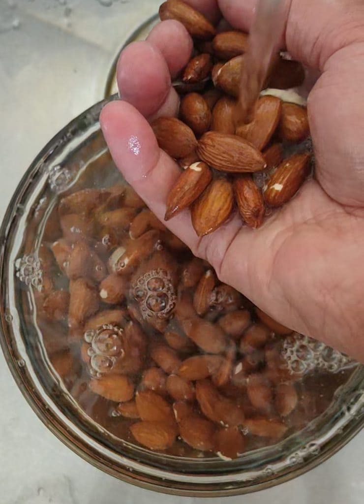 • Depois de escolher qual dos dois métodos utilizar, a frio ou banho-maria, colocamos de molho pelo tempo necessário. Se utilizar o método a frio, as amêndoas devem ser deixadas de molho por 8/12 horas, se optar pelo método a banho-maria, após ferver a água, desligamos o gás e imergimos as amêndoas de molho por 3 minutos.