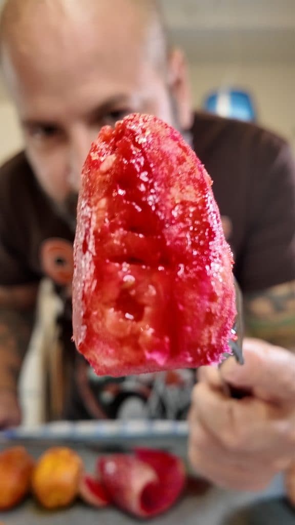 Use luvas para manusear os figos da Índia, descasque-os com cuidado e corte-os em cubos.