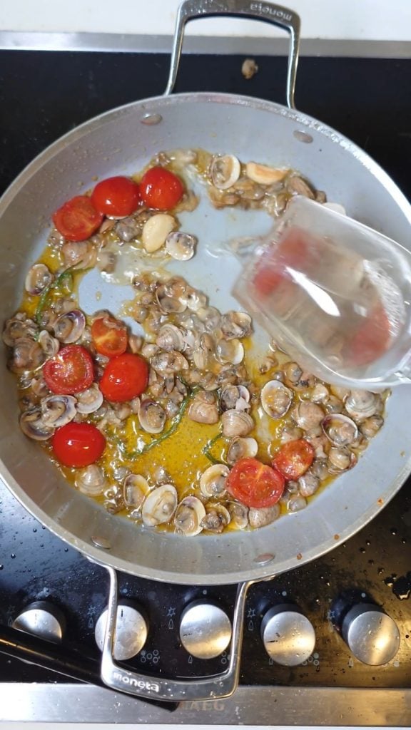 O vinho adiciona uma nota de acidez que limpa o paladar, mas se preferir não usá-lo, pode deglacear a frigideira com um pouco da água filtrada dos vôngole ou com um pouco da água de cozimento da massa.