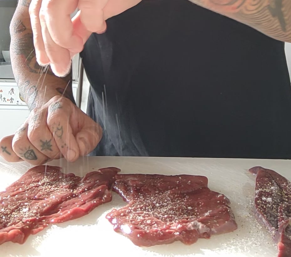 Para fazer o fígado à Lodigiana utilizei fatias de cerca de 50g cada, as lavei, sequei com um pano de algodão e depois salguei e apimentei.
