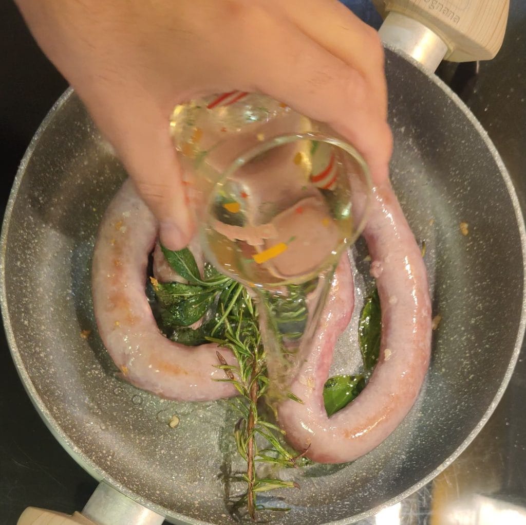 Em seguida, adicionei a linguiça, inteira ou em pedaços, escolha como preferir, pois não faz diferença. Adiciono o vinho branco e deixo cozinhar em fogo baixo por cerca de dez minutos.
