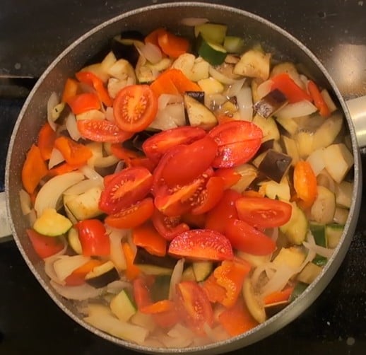 Depois cozinhe os legumes por alguns minutos junto com o vinho branco, para que eles amoleçam um pouco por dentro. Assim que o álcool evaporar, adicione, se desejar, tomates cereja cortados ao meio, para tornar a receita mais completa e ainda mais saborosa.